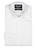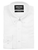Biela bavlnená košeľa bez vzoru, z látky s hladkou textúrou, s klasickým golierom a manžetami na gombíky. Úplný základ, ktorý vyzerá dobre vždy - či už v kombinácii s oblekom, alebo napríklad len tak k džínsom na večer.