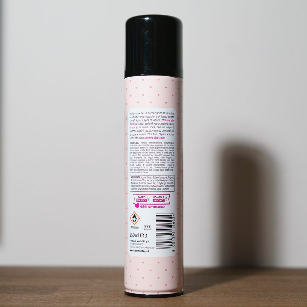 Alcohol Denat., Butane, Isobutane, Propane, VA / Crotonates / Vinyl Neodecanoate Copolymer, Parfum, Macadamia ternifolia Seed Oil, Ethylhexyl Palmitate, Octylacrylamide / Acrylates / Butylaminoethyl Methacrylate Copolymer, Amynomethyl Propanol, Coumarin.