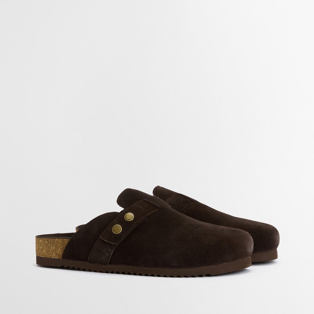 Barbour sandále s uzavretou špičkou a korkovou stielkou, ktorá sa postupne tvaruje podľa nohy. Cez priehlavok vedie pásik s dvoma funkčnými patentkami, ktoré držia topánku na nohe a zároveň umožňujú mierne nastavenie šírky topánky. Podrážka je gumová so zúbkovaným profilom, takže neskĺznete ani na mokrom povrchu. Kombinujte s krbom a poľovníckym psom pri nohách.
