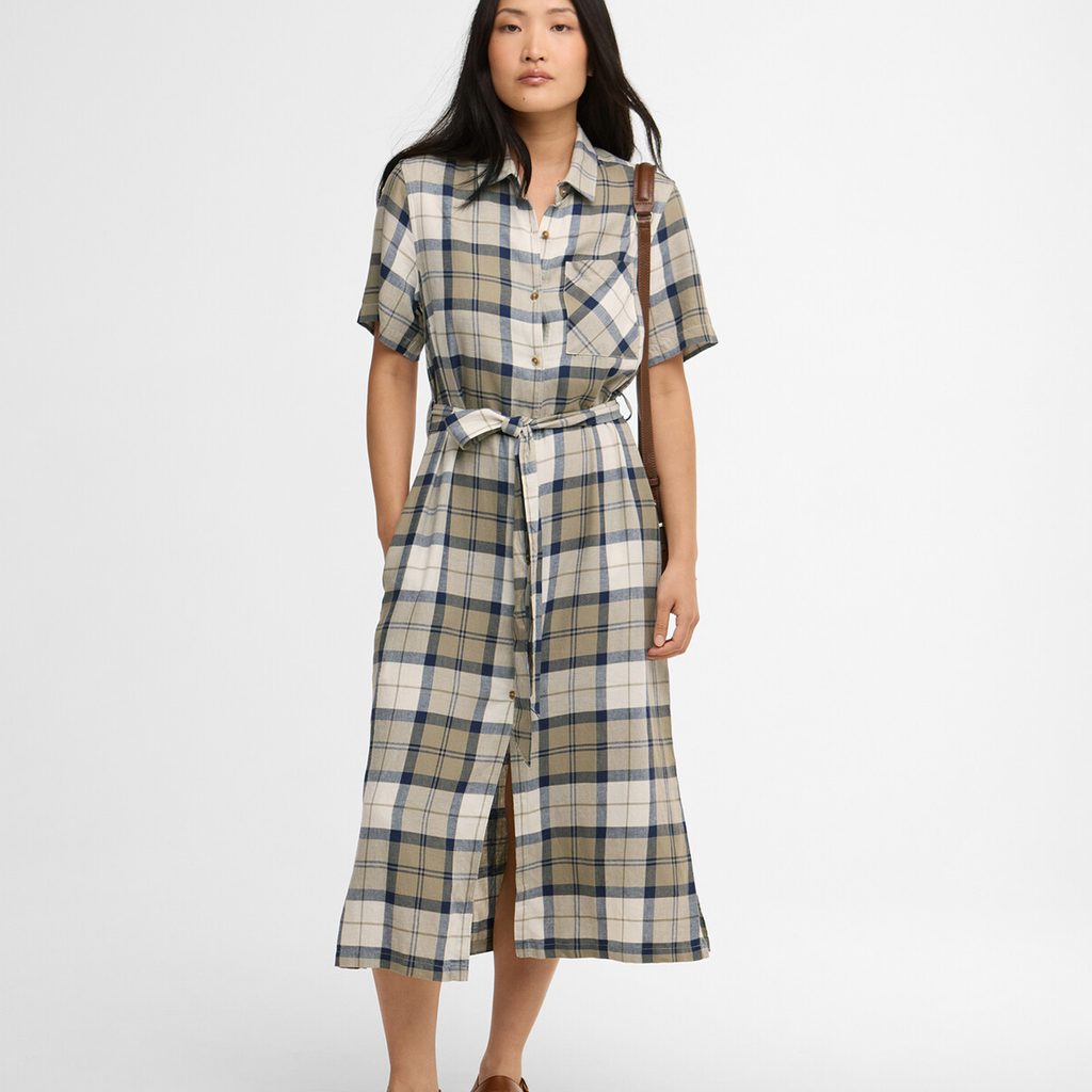 Košeľové šaty z ľahkého mixu lyocellu a ľanu, tj. materiálu, ktorý dýcha a na dotyk je príjemne hladký. Strih je voľnejší, vďaka uväzovaniu v páse si ho však možno ľahko prispôsobiť. Jedná sa o midi šaty, tj. s dĺžkou k lýtkam, s krátkym rukávom a zapínaním na gombíky po celej dĺžke. Na hrudi nášivné vrecko, vzadu pri krku drobný kovový odznak Barbour. Šaty, ktoré fungujú so sandálmi v letovisku aj s teniskami v meste.