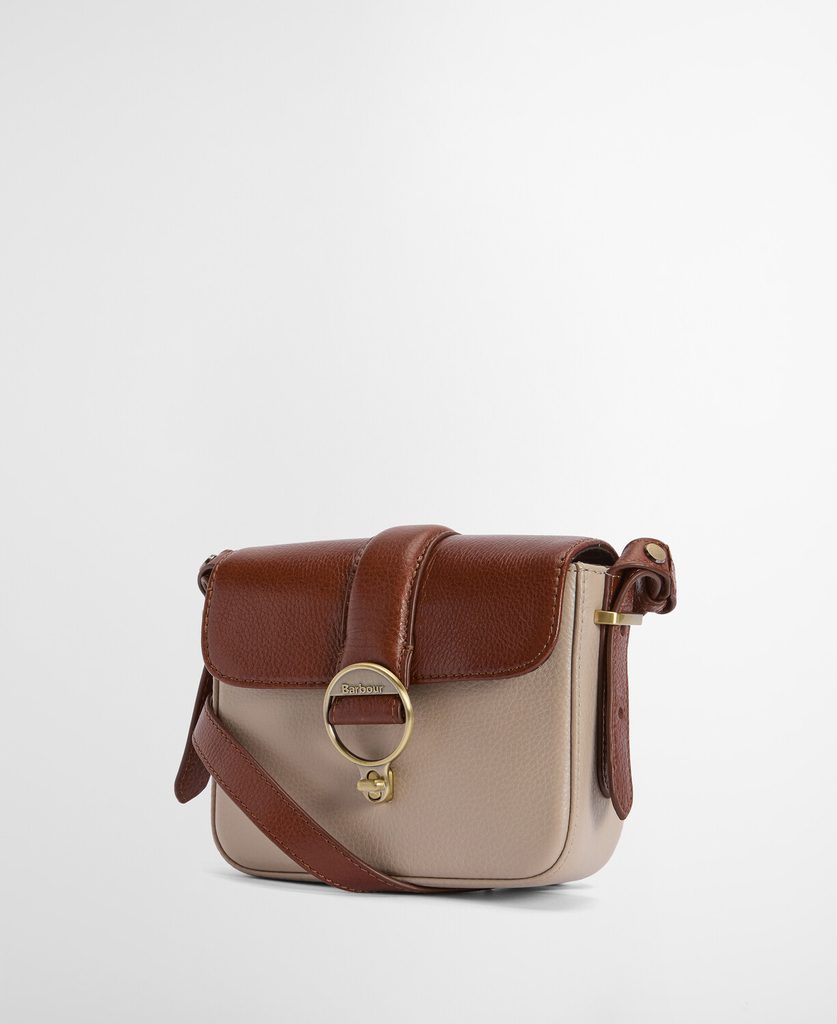 Miniatúrna kabelka Rosa od Barbour je celá z pravej kože: telo je púdrovo béžovej farby, klapka hnedej farby, obe sú zrnité. Klapku zatvára pevný otočný zámok s matnou mosadznou prackou a logom značky.