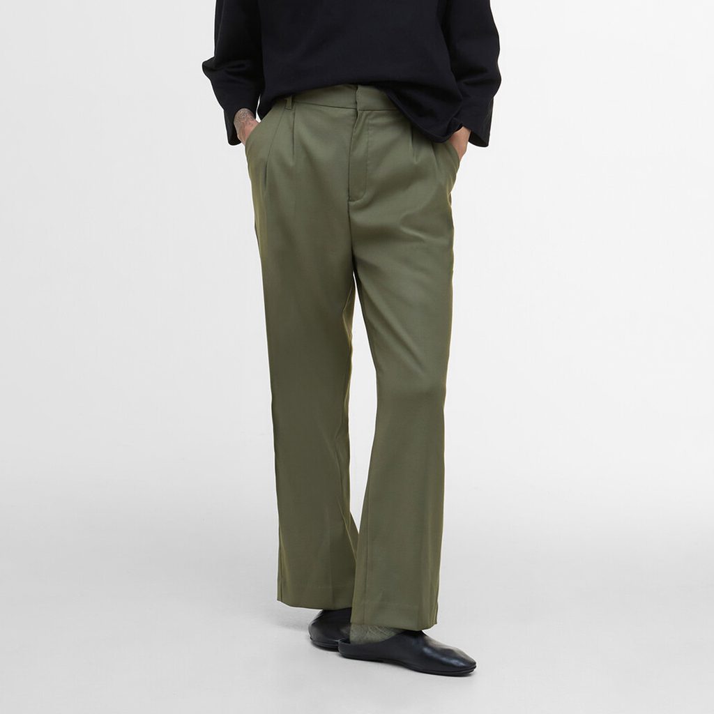 Dámske nohavice khaki farby s pohodlne širšími nohavicami. Toho je docielené vrstvenými zámikmi pri páse, ktoré sa na nohaviciach mierne „rozlievajú“ a poskytujú viac miesta. Zvyšok je riešený akosi minimalisticky: očká na opasok, zakryté klasické zapínanie a dvojica bočných aj zadných vreciek.