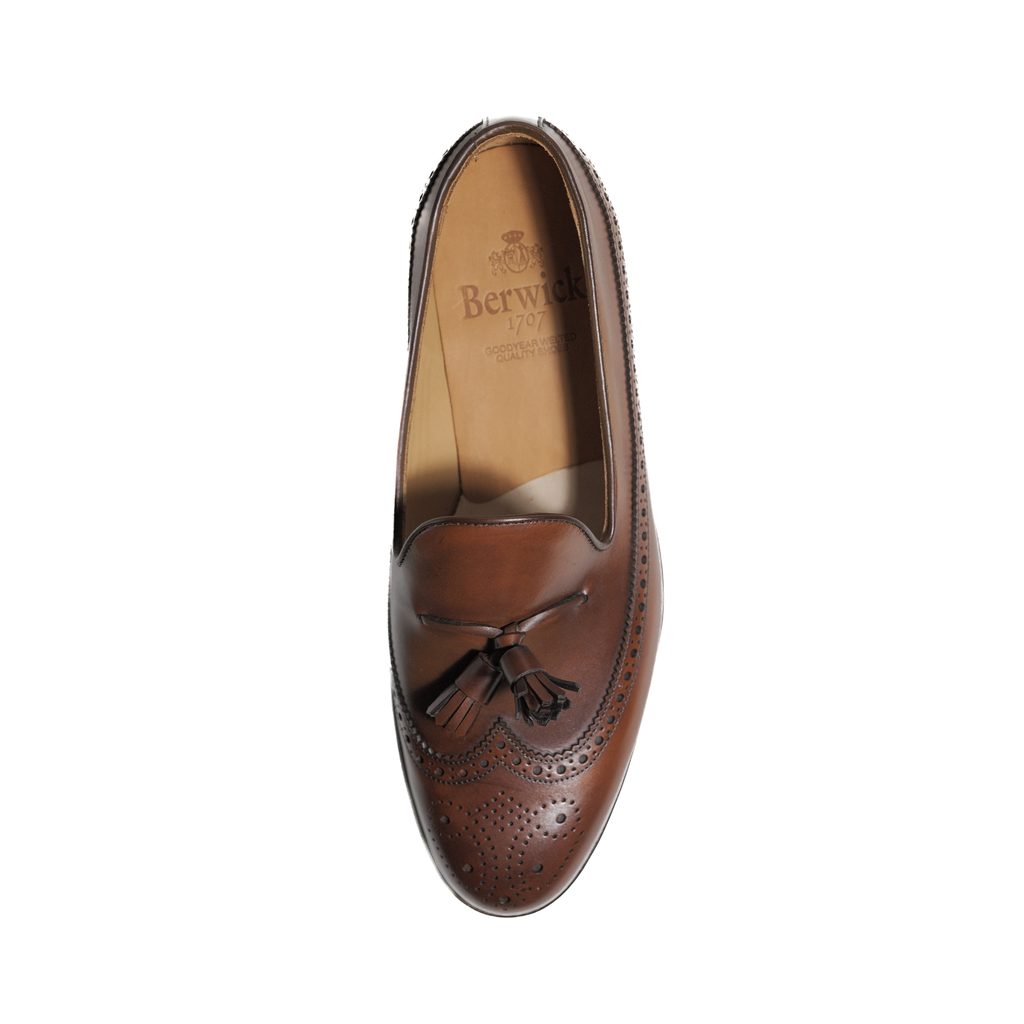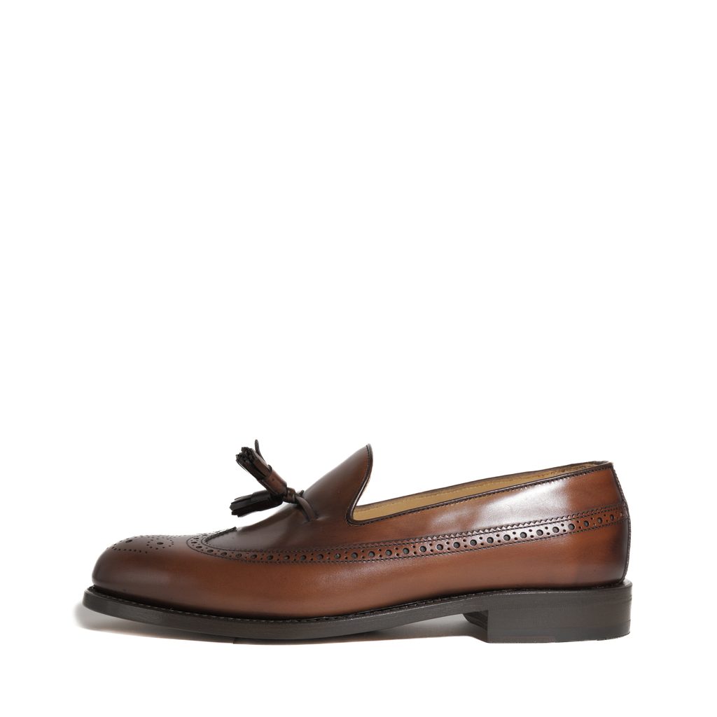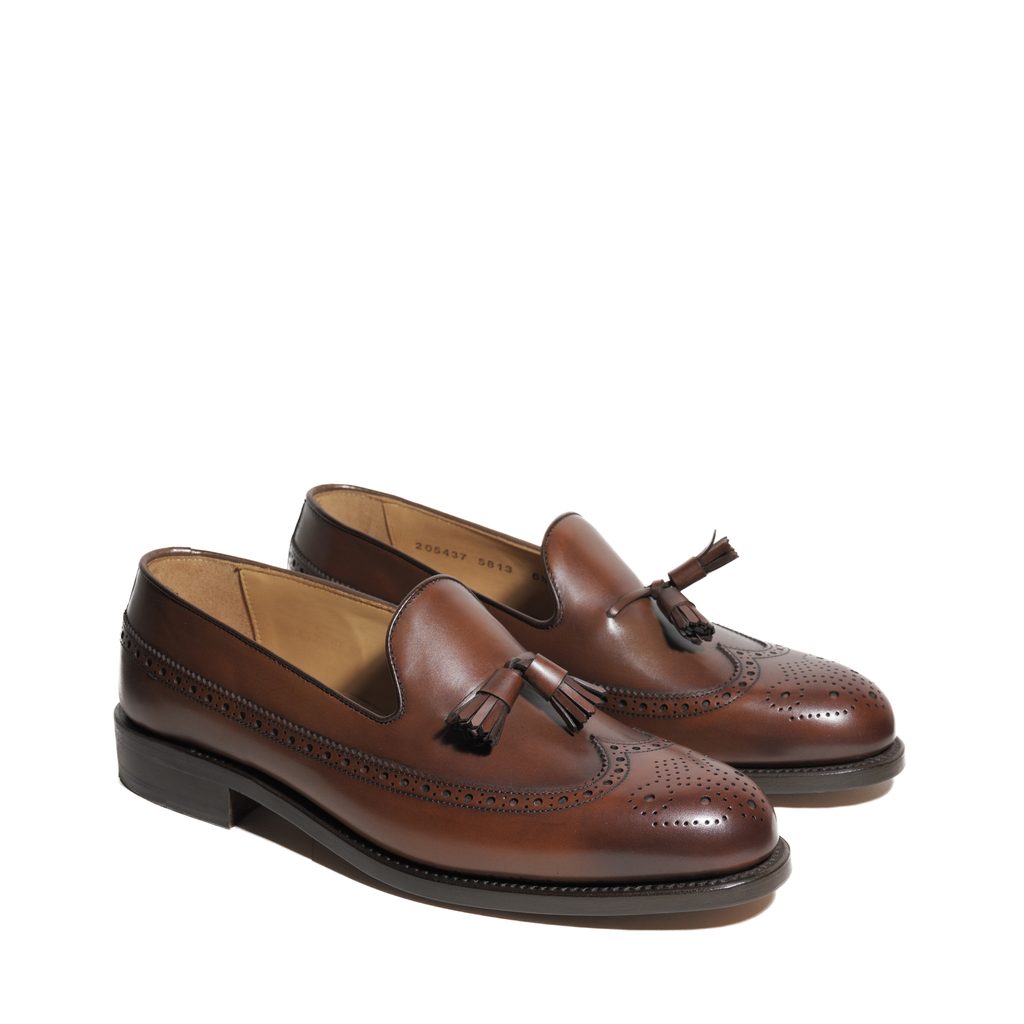 Tassel loafers, mokasíny s charakteristickými ozdobnými strapcami na priehlavku, sú snáď tým najneformálnejším typom formálnych topánok, čo ešte podčiarkne hladká koža a ozdobná brogue perforácia. Ich prirodzený pôvab skvele vynikne napríklad v kombinácii s blazerom a chinos nohavicami.