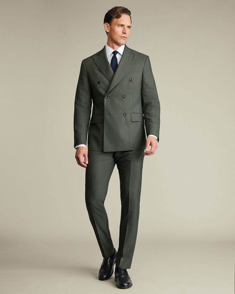 Slovo Sharkskin, ktoré nájdete v názve tohto obleku, odkazuje na špecifický spôsob tkania: do kepru sa striedavo prepletajú dva odtiene priadze (svetlejšie a tmavšie), ktoré tvoria jemný diagonálny vzor. Výsledkom je látka s ľahkým, tlmeným leskom, ktorý sa mierne mení podľa uhla svetla – odtiaľ pochádza názov podľa žraločej kože, ktorá sa vo vode podobne trblieta.