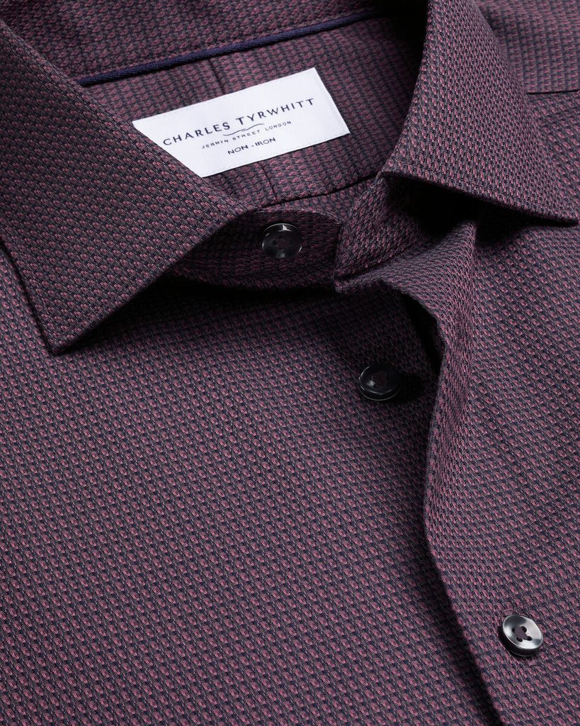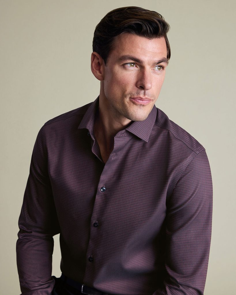 Tmavá kancelárska košeľa, ktorá vyžaruje charakter. Hlavnou dominantou tohto kúsku je nepochybne drobný vzor v textúre po celom tele, tzv. dobby weave. Mimo svojrázny, ale nekrikľavý vzor ide však o spoľahlivú klasiku: bežný otvorený golier, dlhé rukávy na klasické gombíky so štýlovo zaoblenými lemami. Nesmie chýbať ani úprava bez žehlenia, vďaka ktorej už do práce rozhodne neskoro neprídete.