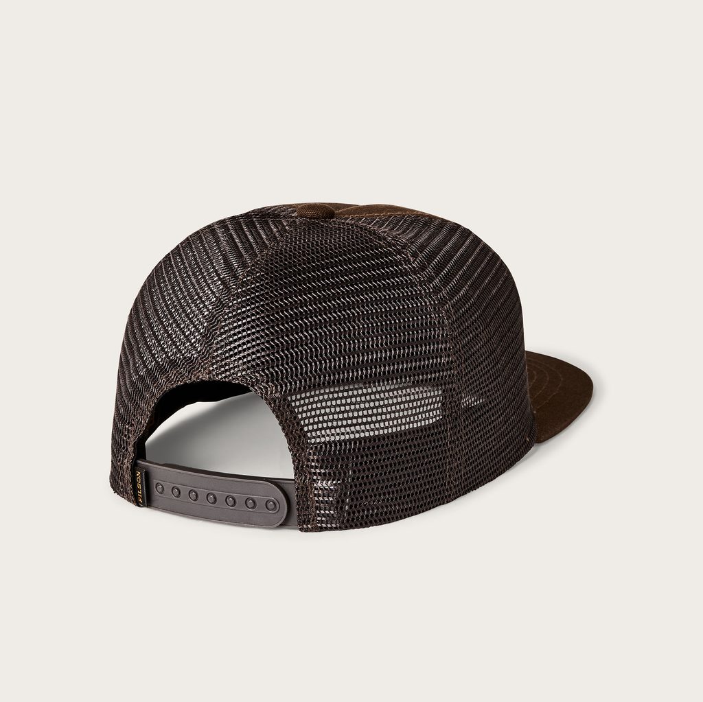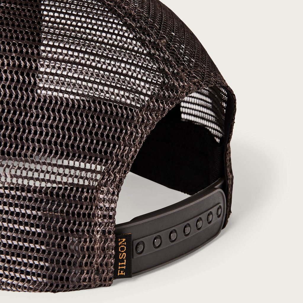 Mierne moderná šiltovka „truckerka“ americkej workwearovej značky Filson s klasickou konštrukciou: predné diely sú z pevnej bavlny, zvyšok zo sieťoviny, aby hlava na cestách dobre vetrala. To viete, vtedy ešte nebola klimatizácia. Predný panel je navyše spojitý (k tomu s peknou nášivkou mušky) a šilt takmer úplne rovný.