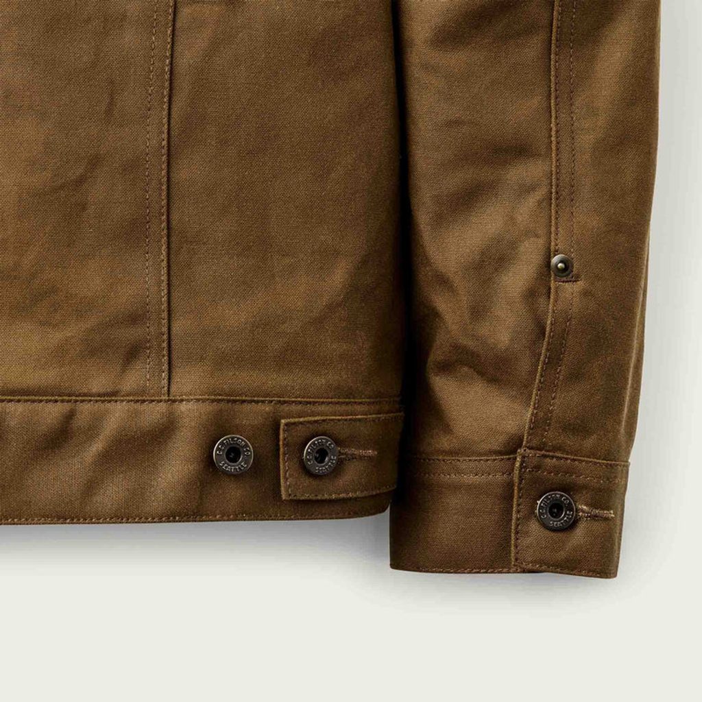 Materiál, o ktorom je reč, je 14oz Tin Cloth z britskej tkáčovne Millerain – voskované bavlny v plátnovej väzbe, ktorú Filson používa už vyše sto rokov, od roku 1912. Štrnásť uncí na yard je zhruba dvojnásobok toho, čo ponúka väčšina konkurenčných voskovaných búnd. Tkanina je tak hustá, že bravúrne odoláva pretrhnutiu a vode, a zároveň sa časom rozchodí a prispôsobí telu podobne ako tvrdý denim. O patine, ktorú po rokoch nosenia získa, ani nehovoriac.