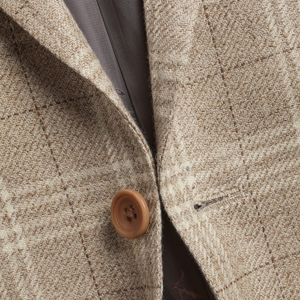 Práve vďaka vyladenej zmesi dvoch látok ide o celoročne pohodlný blejzer. Sako ponúka kvalitný materiál a podšívku zo zmesi polyesteru a viskózy, tradične so vzorom brandového maskota Charlesa Tyrwhitta: vtáka cíbika. Podšívka je navyše do konštrukcie saka vsadená v štýle piano facing, čo je jeden z tvarov podšívky typických pre londýnsku Savile Row.