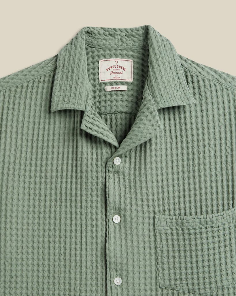 V tohtoročnej letnej kolekcii Portuguese Flannel je košeľa Cornelius o trochu menej „letná“, za to o dosť viac svoja a svieža. Dominuje jej vafľová štruktúra použitej bavlny sviežej zelenej farby. Všetko ostatné však zostáva, ako to máme najradšej: voľnejší strih, svetácky plochý golier, perleťové gombíky a rodinná talianska výroba.