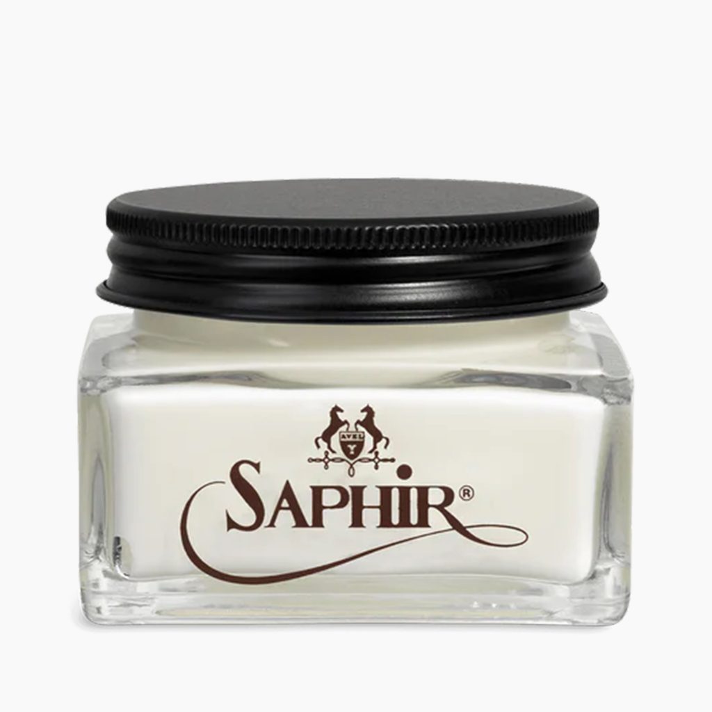 Krém na olejovanú kožu od legendárnej francúzskej značky Saphir. Hlavnou zložkou je olej z nôh kráv (neatsfoot oil, starý známy v obuvnom priemysle), ktorý udržuje prirodzenú mastnotu a vodeodolnosť kože, teda presne to, čo olejovanú kožu odlišuje od bežnej. Kožu tiež zmäkčí a ochráni pred vysychaním.